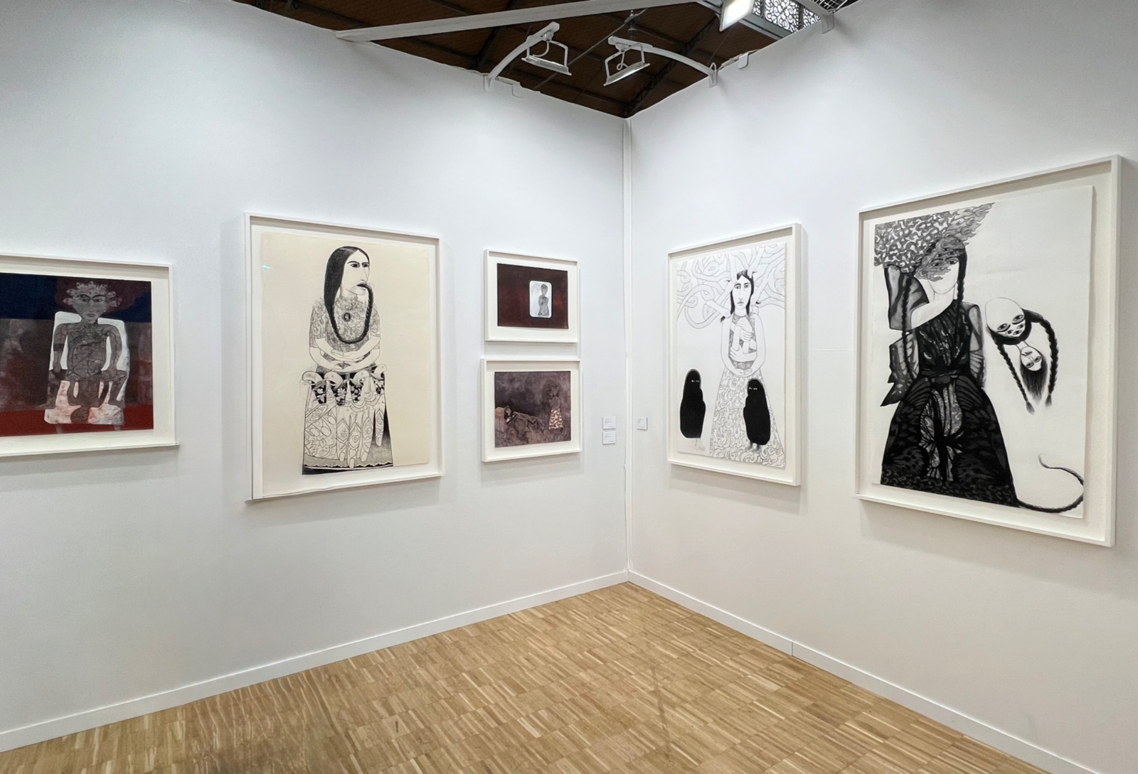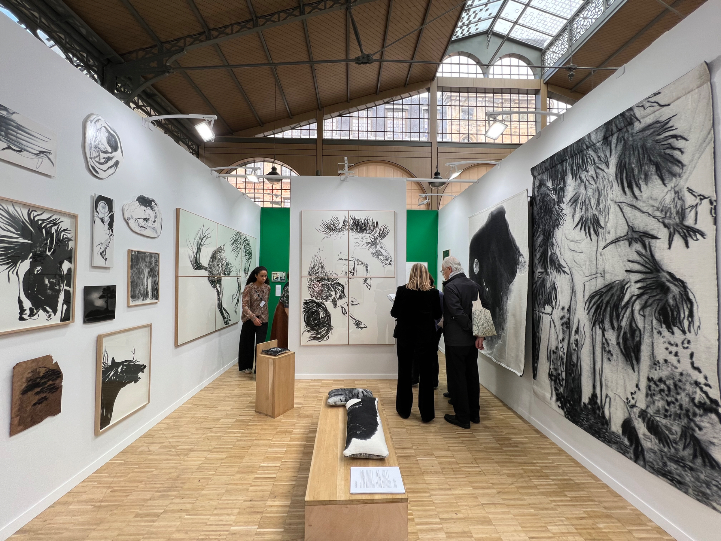 À droite, la galerie Richard Saltoun de Londres expose les figures féminines au fusain chargées de symboles de l’artiste anglo-iranienne Samira Abbassi, à la croisée des cultures perse et occidentale. De l’autre côté, la galerie Alain Gutharc présente une série de dessins à l’encre et aquarelle d’Edi Dubien, voisinant avec les paysages sylvestres peuplés d’animaux de Suzanne Husky, lauréate du prix Drawing Now en 2023.