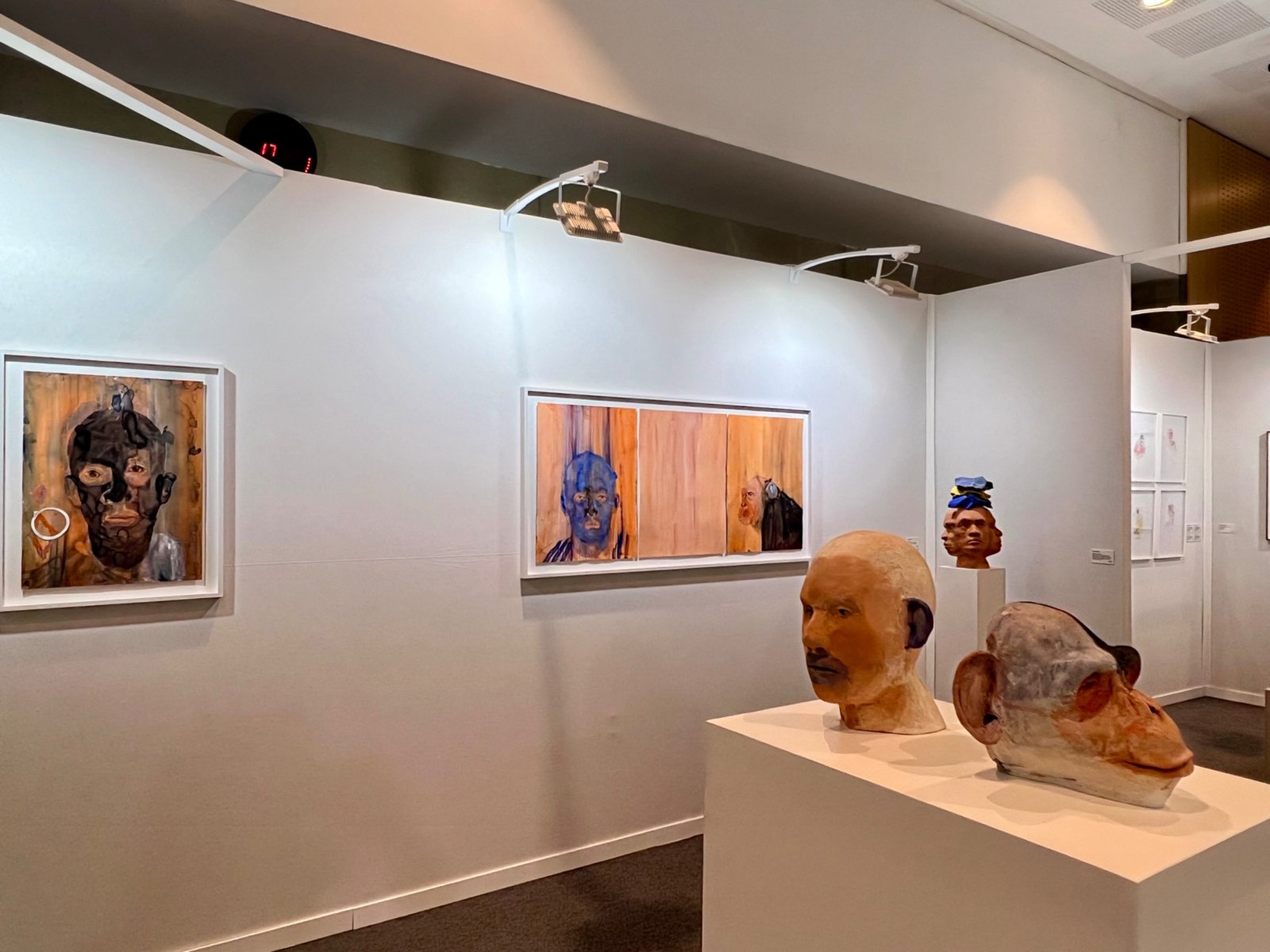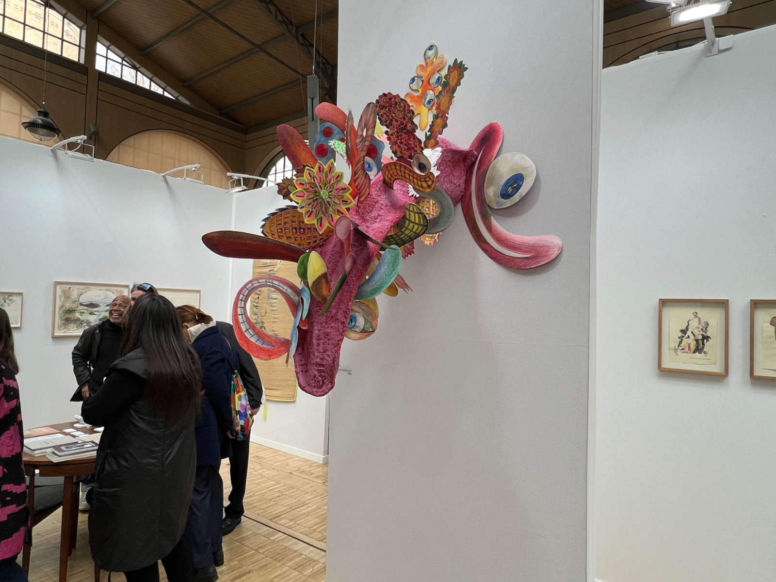 Chez Claire Gastaud, les dessins de Delphine Gigoux-Martin occupent tout l’espace du stand en se déployant sur une multitude de supports (tissu, porcelaine, papier, tapisserie…). À côté des énigmatiques portraits sur plâtre de Sophie Kuijken élaborés à partir d’images de fragments de corps recueillies sur internet, la galerie Nathalie Obadia propose un tableau de Jérôme Zonder associant papier et tissu découpés, marouflés sur toile. La galerie Papillon met en focus les dessins colorés de Frédérique Loutz, dont une sculpture de monstre joyeux réalisée au crayon de couleur sur papier collé semble jaillir du mur.