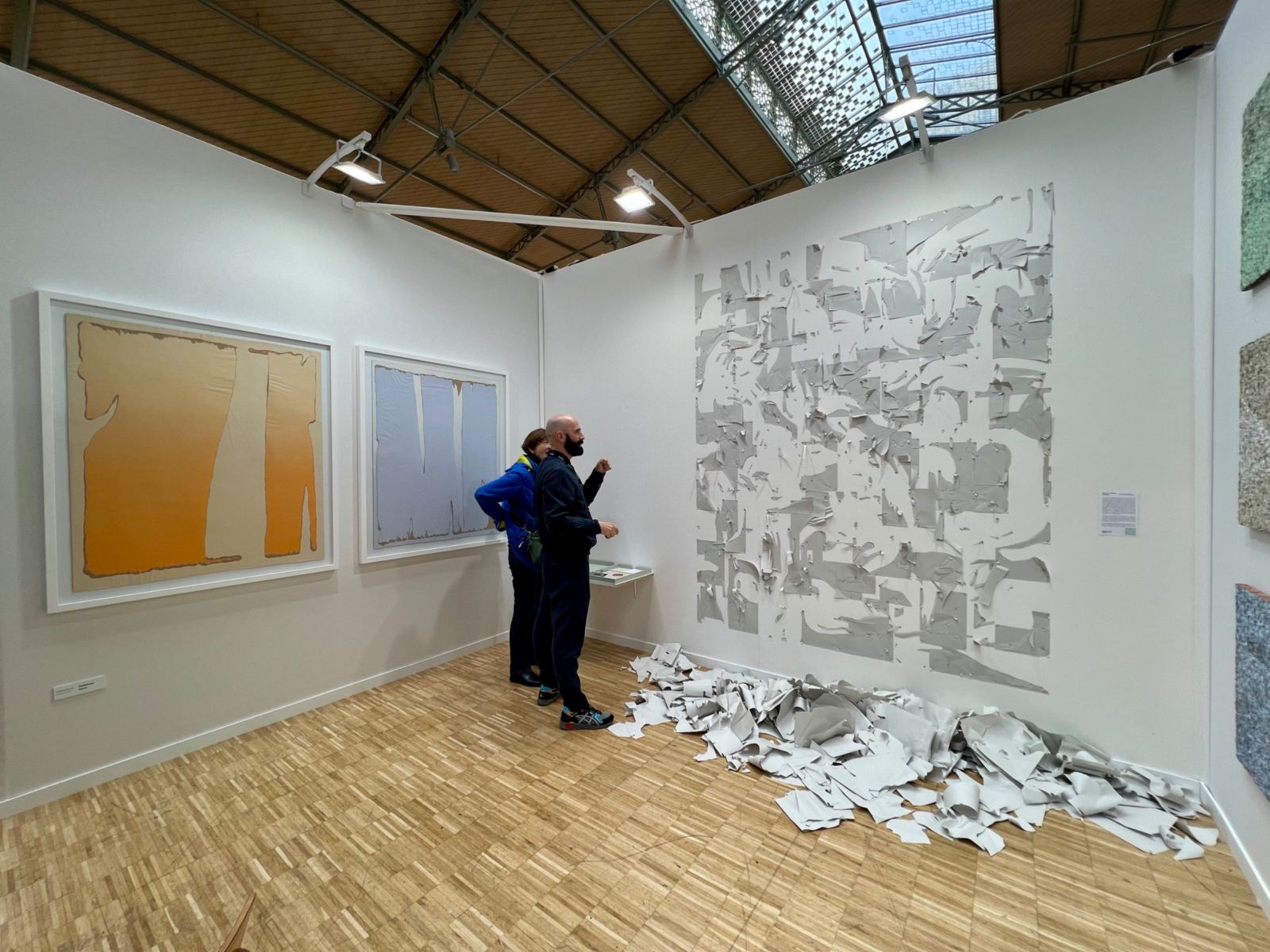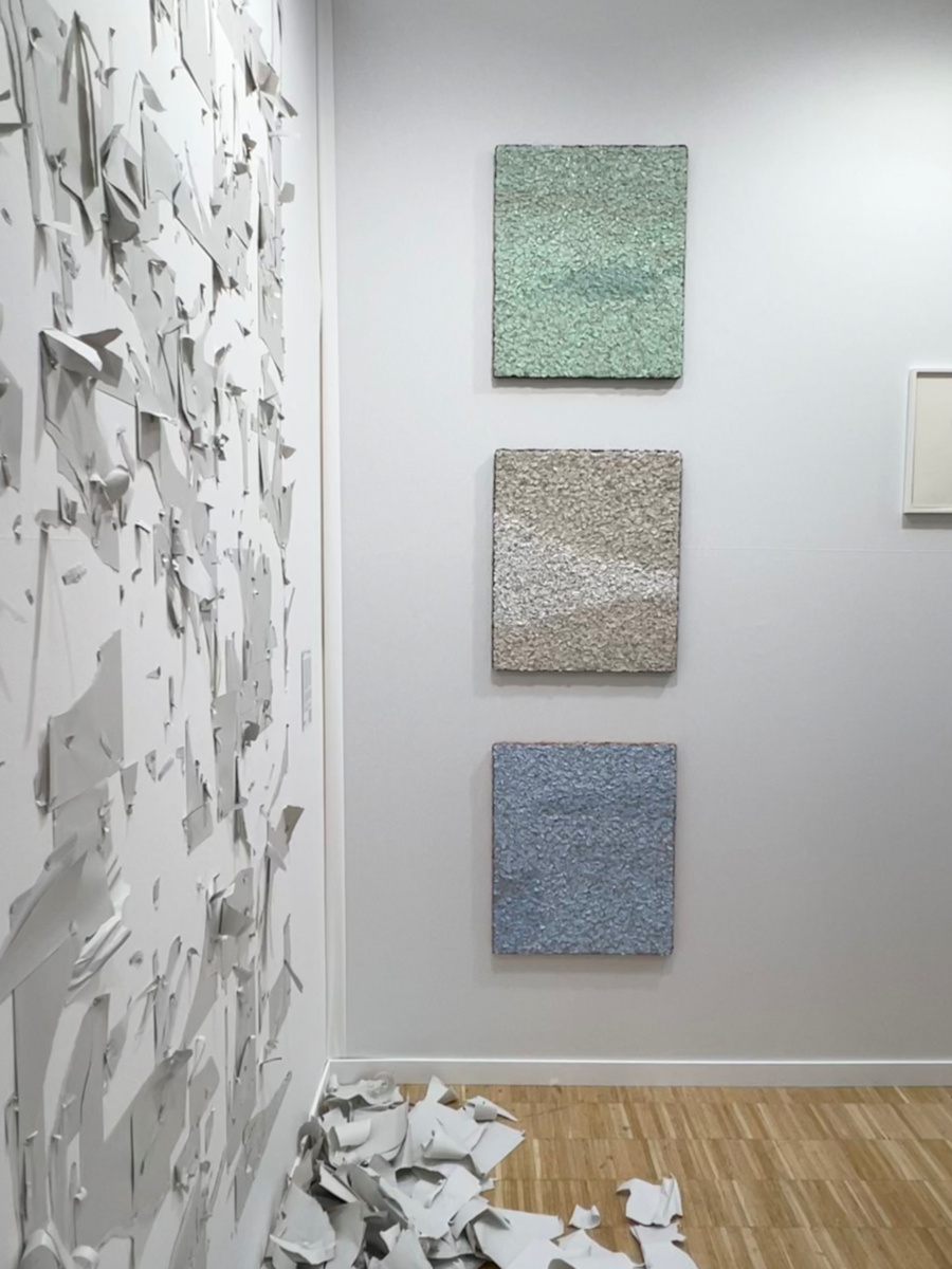Sur le stand d’Irene Laub (Bruxelles), l’Espagnol Guillermo Mora a agrafé au mur des dizaines de feuilles de papier préalablement peintes qu’il a assemblées en une grande composition abstraite, avant de déconstruire celle-ci en arrachant les feuilles dont il ne reste que des lambeaux – les morceaux de papier déchirés gisant sur le sol (‘Si Pero No’). Influencé par le pointillisme, l’artiste déchire aussi en tout petits fragments ses feuilles peintes avant d’en refixer soigneusement les morceaux sur des panneaux de bois à l’aide de centaines d’agrafes, en les déclinant en légères nuances de couleur.