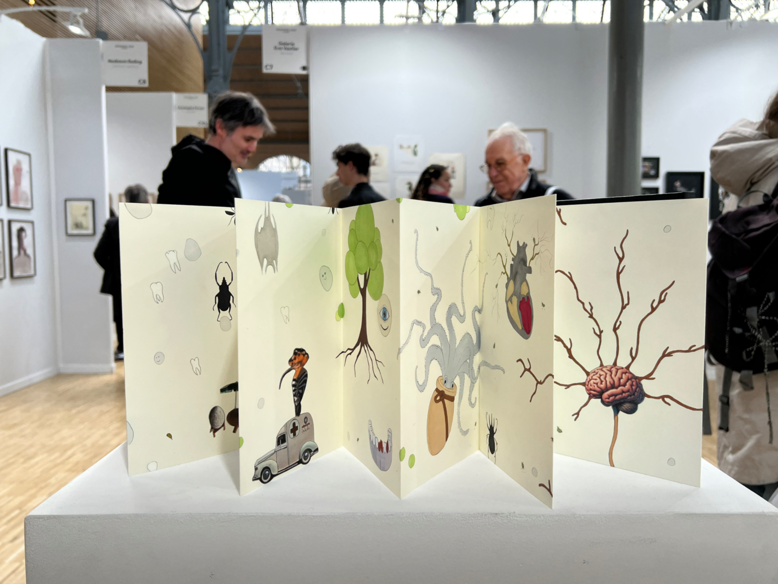 La galerie Martel spécialisée dans l’illustration présente un bel ensemble de dessins anatomiques et mythologiques du Suisse Thomas Ott, incisés sur carte à gratter. Chez Maurits van de Laar (La Haye), on retrouve les grands collages illustrant les scènes très mouvementées de la Catalane Susanna Inglada, la lauréate du prix Drawing Now 2025 qui bénéficie jusqu’au 10 mai prochain d’une exposition au Drawing Lab (17, rue de Richelieu, 75001 Paris).