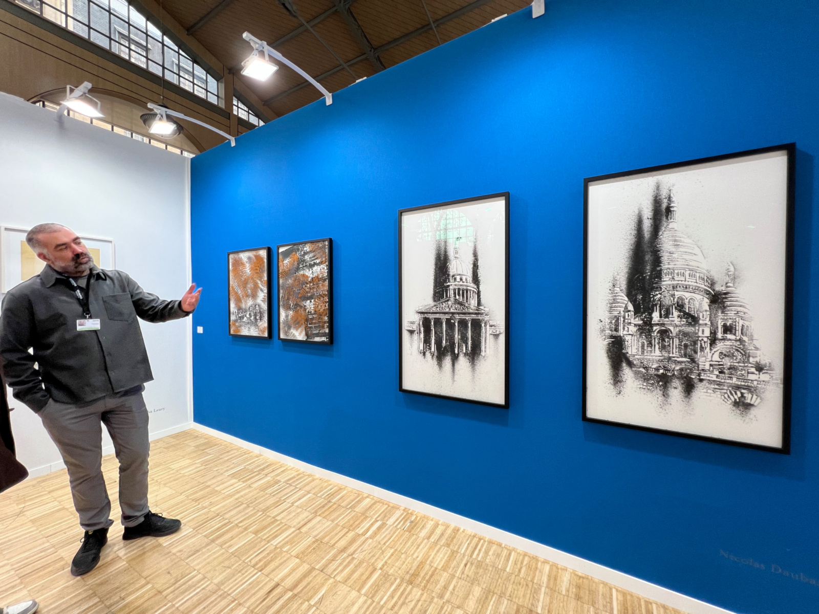 Nicolas Daubanes (déformé par le grand-angle) devant ses oeuvres, galerie Maubert