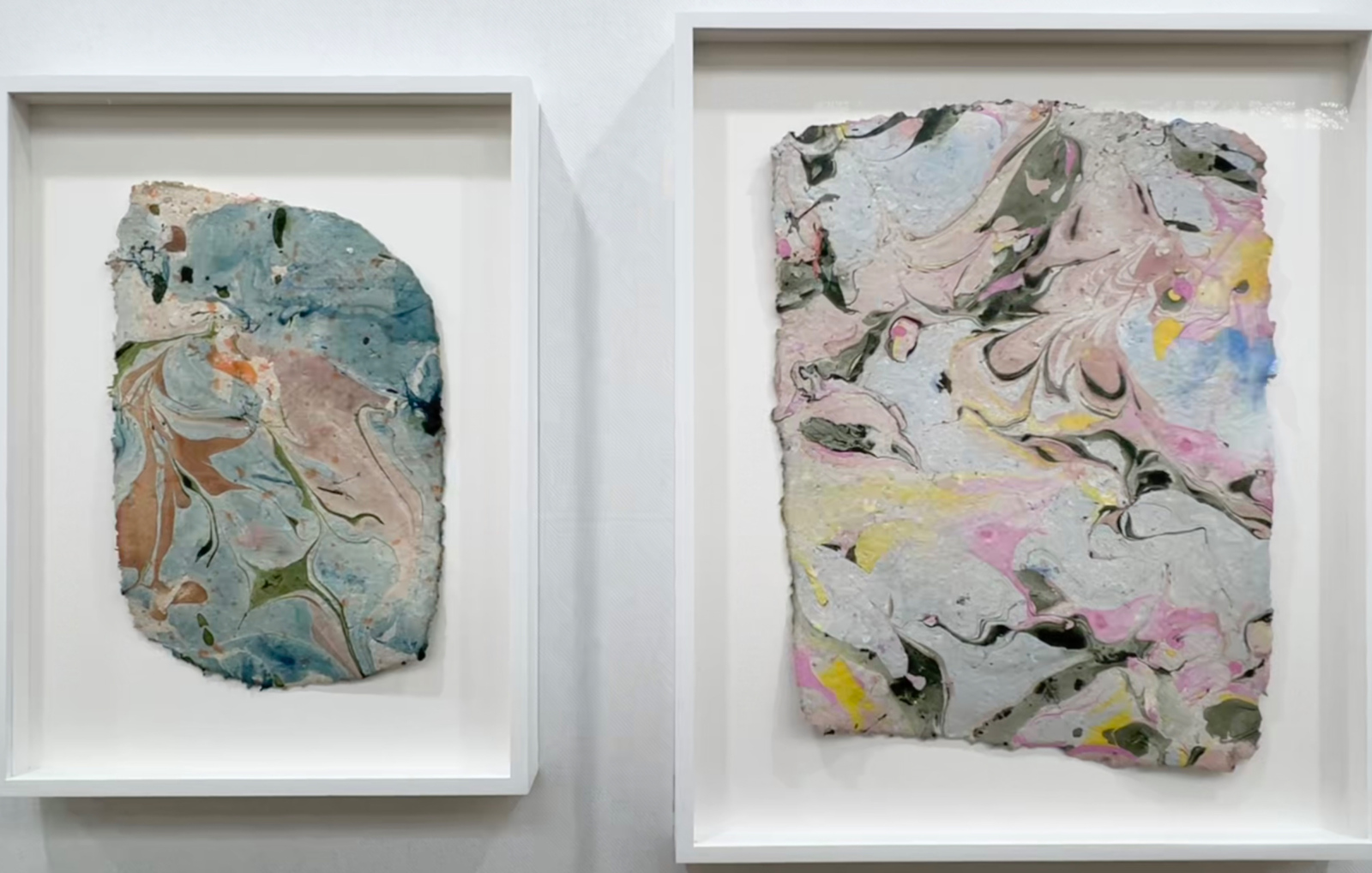 En face, la galerie bruxelloise Archiraar montre les étonnants dessins chamaniques tracés à la fumée de Roman Moriceau, finaliste du prix Drawing Now 2026, ainsi que ses papiers mâchés teintés au vernis à ongles évoquant d’anciennes reliures.